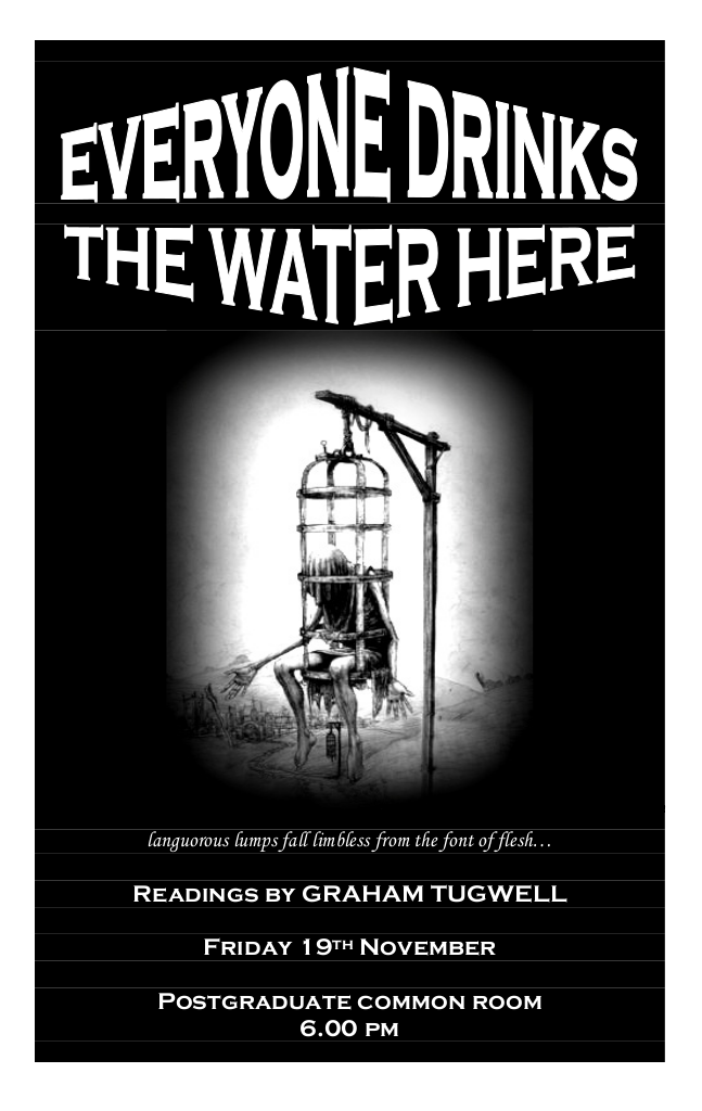Having already tested the waters with a successful reading of his own poetry, it was suggested by Alex that a public reading of my work would be something our fellow postgrads would like to see.The first of these shows, named Everyone Drinks the Water Here after a line in ‘I Arrive’, one of the earliest stories written, took place in November of 2010 in the Postgraduate Common Room of Trinity College. I was joined by Kate Ellen Roddy in the reading of five short stories.