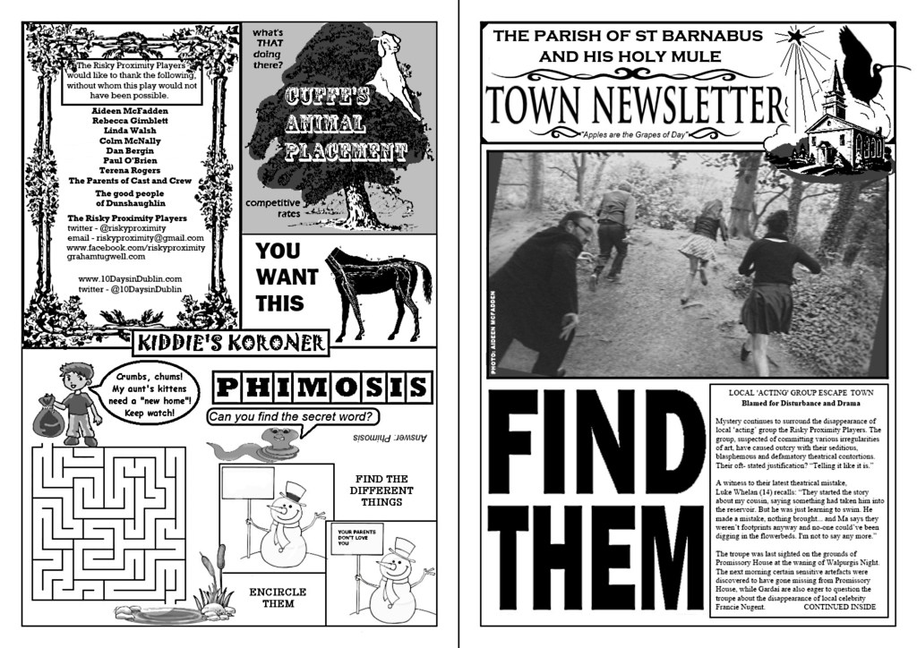 February 2013 saw the Risky Proximity Players return for three nights with a full scale theatrical adaptation of High Five, Danny O’C! as part of the Collaborations Festival, starring Dave Rudden, Sinead O’Brien and Graham Tugwell. The show was performed with aplomb and panache in Smock Alley Theatre.
