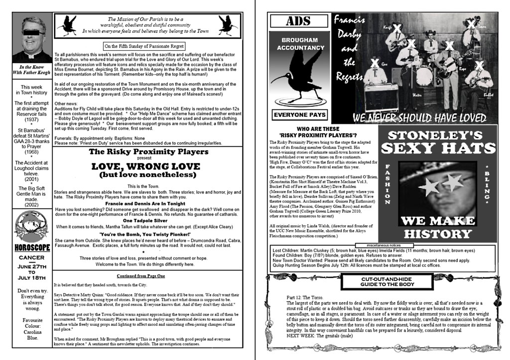 The Risky Proximity Players returned in July 2o13 with Love, Wrong Love as part of the 10 Days in Dublin festival, performed in the New Theatre in Temple Bar