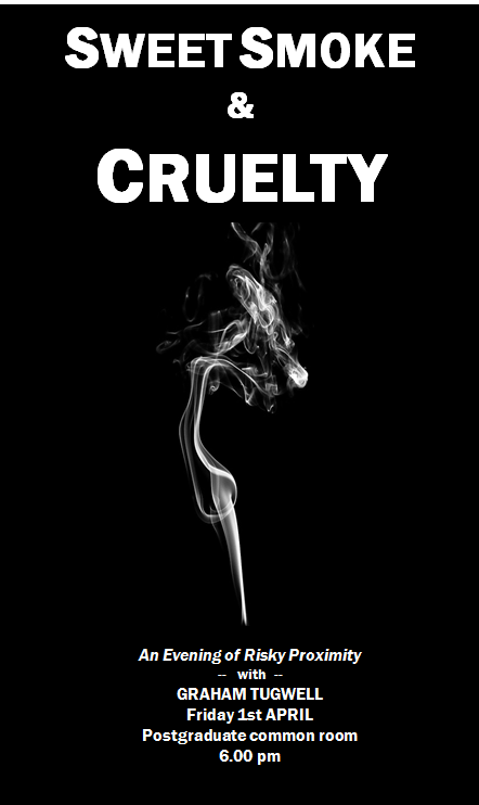 The second of these shows was titled Sweet Smoke & Cruelty (I fear the origin of this phrase is lost to the ages) and was also performed in the Common Room at Trinity College on April 1st 2011. This was the show that set the model of what was to follow: four performers reading the stories, arrayed in chairs, each with their own book to read from. The stage was lit with a plethora of lamps to create a rather pleasing scene.